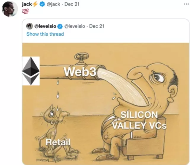比如推特的創始人傑克·多西就轉圖諷刺:“ Web3.0 不是把價值歸還給用戶嗎?你們這些代表大資本的風投為啥比用戶還起勁?莫非Web3.0 是假,你們資本賺大錢才是真?”