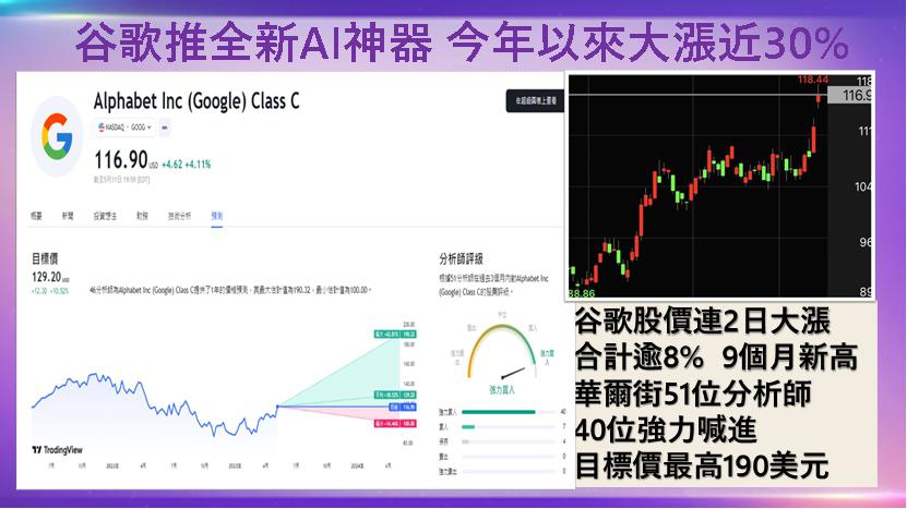 2023年I/O開發者大會上,google發表了多項 AI人工智慧的創新應用。最受矚目的是旗下聊天機器人Bard也將全面升級。其股價連續兩天大漲逾8%,來到9個月新高。