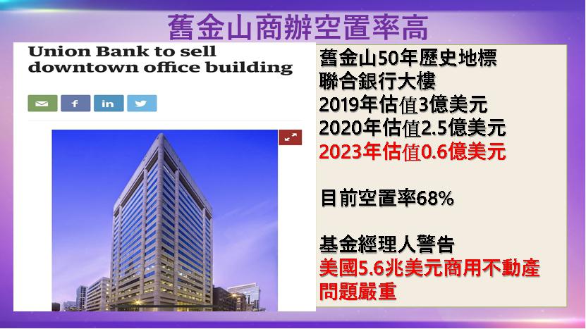 最具指標性的風暴中心,在加州的舊金山。舊金山市中心的空置率不斷上升-即使是管理良好、區位極佳的聯合銀行大樓,空置率達68%,32%有租戶的單位,租約將在一年半後都將到期。
