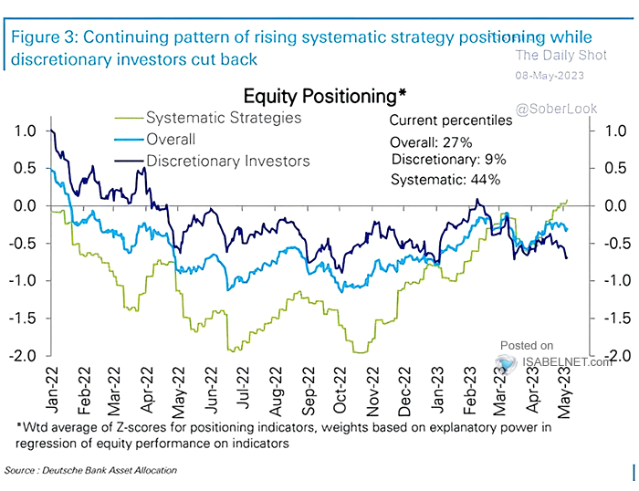近期依據動量、波動訊號投資的量化系統策略基金大舉買入美股,持倉已超過中性水平,但透過經濟、盈利趨勢決策的基金則繼續減持,持倉水位接近一年低點 (圖 1-3),上次如此大的分歧發生在 2019 年,當時後者在接下來幾個月內⋯⋯