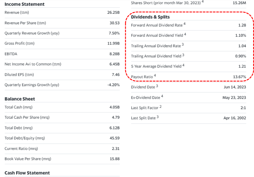 預估未來的股利率(Forward Annual Dividend Yield)為1.1% 及公司股息配發率(Payout Ratio)為13.67%等。