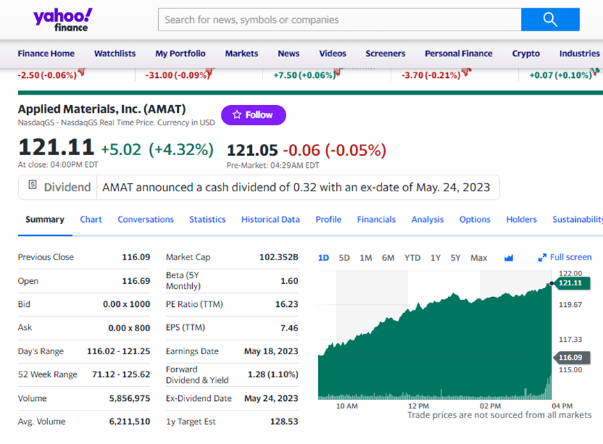 圖中,就有列出AMAT公司,每股盈餘(EPS)、本益比(PE)及未來配發的股息等。
