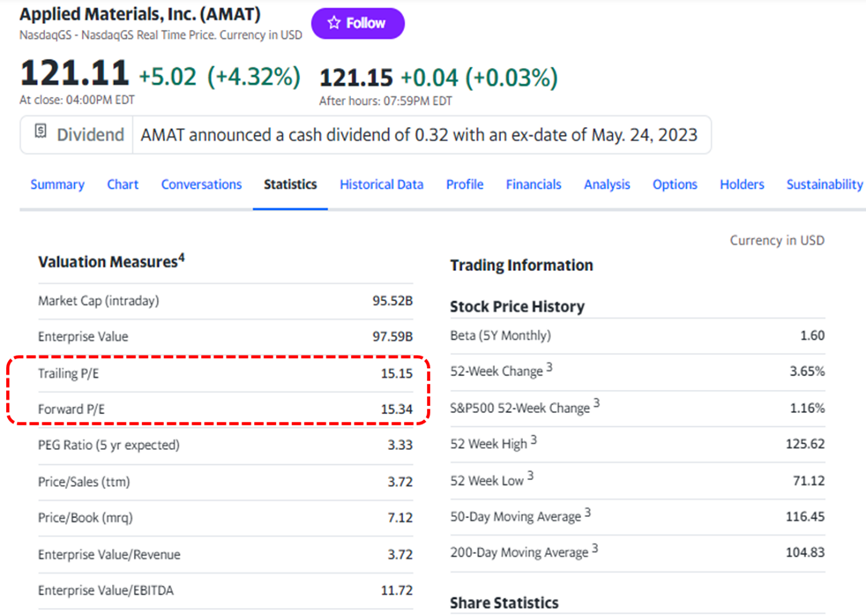 從上表中,我們就能查到,AMAT在過去一年的本益比(Trailing P/E)為15.15倍及預估未來一年的本益比(forward P/E)為15.34倍。
