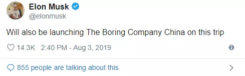 2019年8月,馬斯克發推稱:將會在世界人工智能大會中國之行,啟動Boring Company的中國項目。