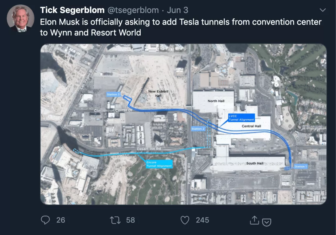 據外國媒體報導,6月3日,克拉克縣專員Tick Segerblom發表推特公佈了擬挖隧道的地圖,該隧道從拉斯維加斯會議中心(Las Vegas Convention Center)向西延伸至永利度假村(Wynn Resorts)旗下的兩棟賭場酒店永利(Wynn)和安可(Encore)。6月9日,永利度假村也正式宣布將和無聊公司合作,並已經提交了項目的土地使用申請。