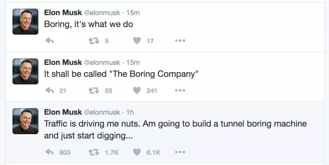 無聊公司的成立起源於一次堵車,2016年12月17日被堵在街上一動不動的馬斯克連發3條推特,宣布要成立一家公司專門解決堵車問題。