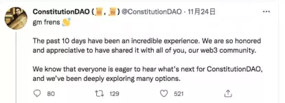 就連ConstitutionDAO的創始人也在推特上說,“我們眾籌購買《美國憲法》的項目失敗了,但我覺得這沒關係,我們已經創造了歷史,沒有一家自治組織能夠在短短一周時間裡籌集到4700萬美元,我們利用區塊鏈技術第一次做到了自治組織大額融資,而所有的一切都只是來自於一個拍賣《美國憲法》的想法”。