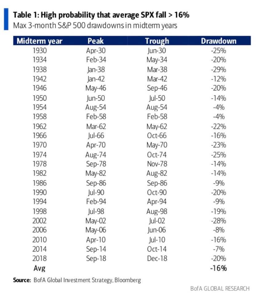 這樣的預測其實不是毫無根據,根據 BofA 美國銀行的研究,美股在期中選舉年時,連續 3 個月的平均下跌幅度達 16%,而今年適逢拜登政府的期中選舉年!