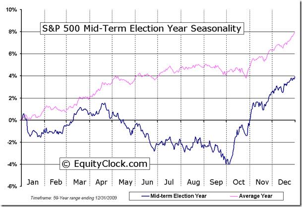 根據 EquityClock 的統計,美股在其中選舉年的平均報酬率為 4%,走勢在第二、三季都是下跌的趨勢,直到第四季才能大幅回升 (下圖藍線),波動遠大於平均走勢 (下圖紅線)。