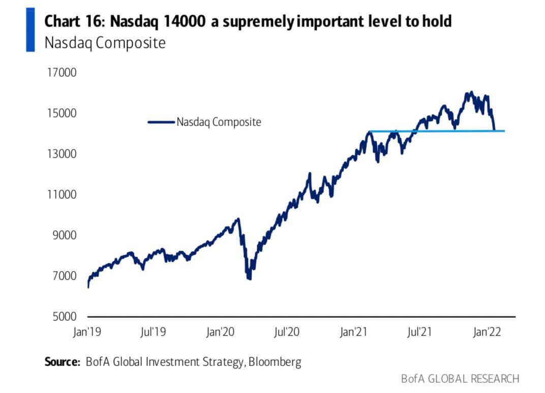 Nasdaq 指數日 K 走勢已經跌破年線支撐,BofA 昨天罕見用 “supremely important” 認為 14000 點是 Nasdaq 指數極為重要的支撐!