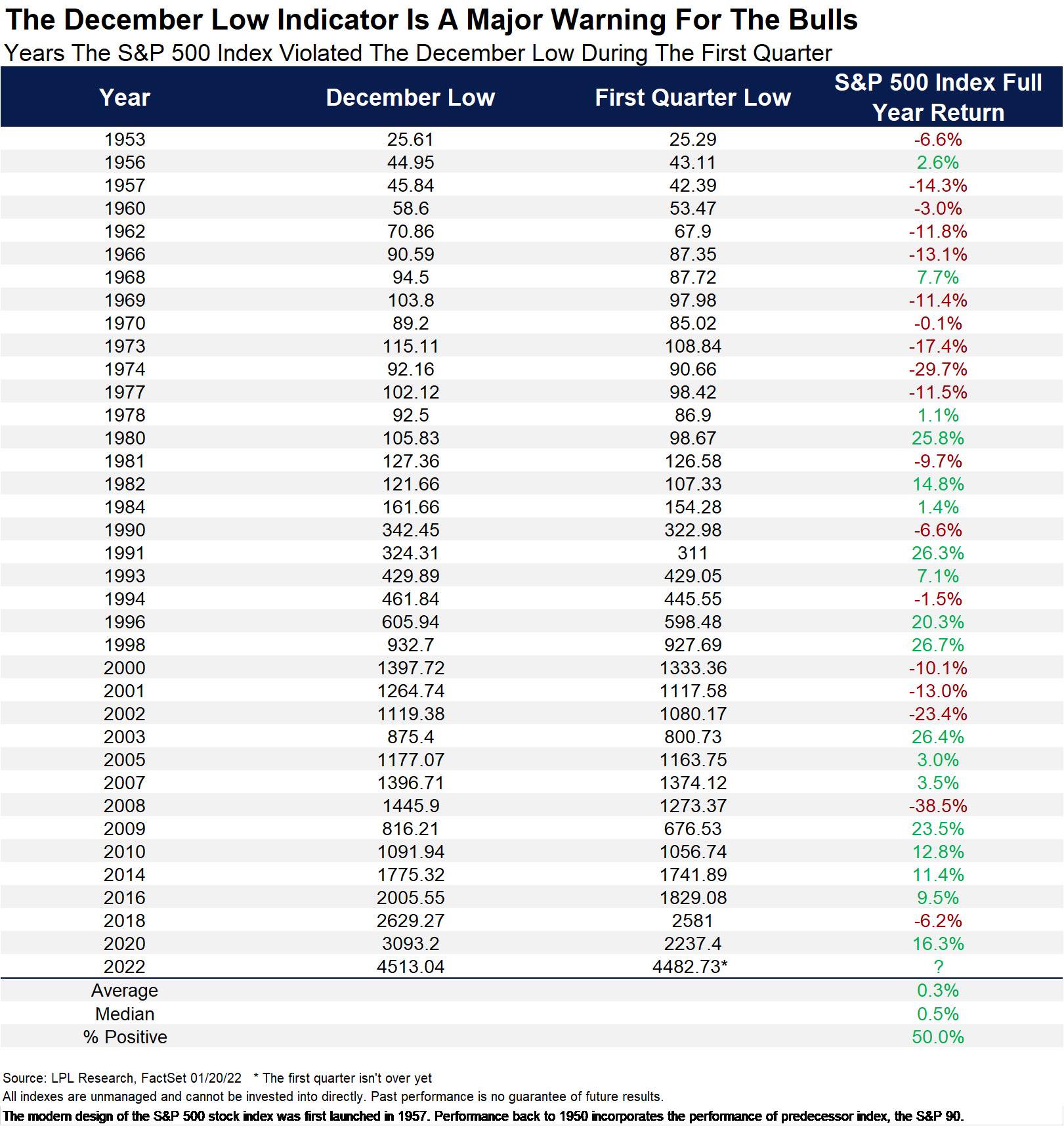 LPL Research 昨天也發出資料顯示,開年第一季如果股市低於前一年 12 月低點時,S&P 500 指數全年平均報酬率只有 0.3%、中位數為 0.5%,S&P 500 在 1 月 20 日收在 4482,已經跌破去年 12 月低點的 4513 點。