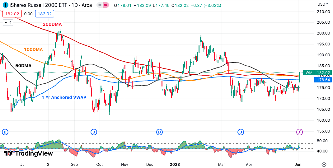 Q1 財報季已結束,5 月投資人搶進科技股 (圖 1-3),但上週五出現板塊輪動徵兆,RSP、QQQE 等權重 ETF 漲幅超越指數 ETF,道瓊工業指數大漲 2.12%,羅素 2000 ETF IWM 大漲 3.63% …