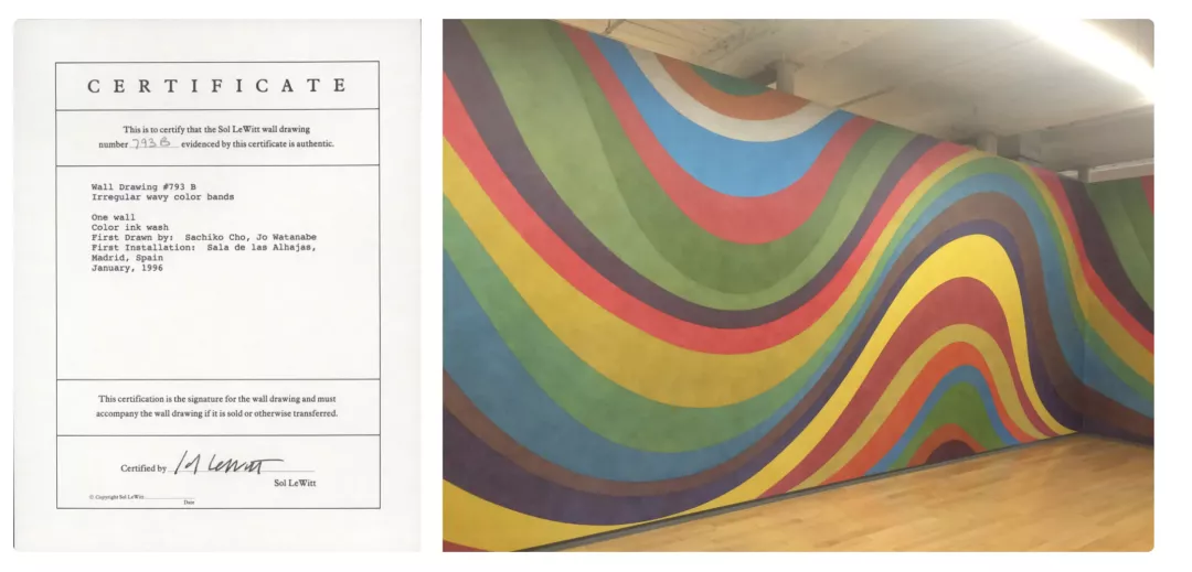 雖然這是一種兩極分化的典範,但它並不完全新穎,在分發和獲取概念作品時也存在類似的想法,例如Sol LeWitt 的壁畫。在這些情況下,“擁有”和轉讓的東西(由收藏家、博物館、機構獲得)可能只是簽名的真品證書。我們可以通過類似的方式看到加密藝術:分發和交易的代幣不是文件,而是更類似於藝術家簽名的真實性證書,每個證書都與特定的媒體、藝術品或想法有一些概念上的聯繫。