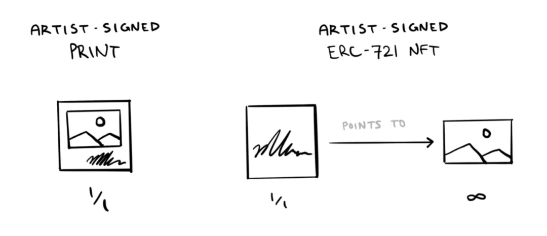 所有這些都非常類似於由數字媒體製作的簽名噴墨打印。例如,考慮一位藝術家銷售限量版印刷品,這些印刷品代表了他們創作的一些數字藝術品。藝術家選擇任意版本尺寸(1、5、50 等),承諾不會分發超過此數量,並在每幅版畫上簽名,彷彿在說“這件物品很特別”。如果作品受到高度重視,其他人可能會尋求購買並擁有它,也許該物品最終會在私人和公共收藏中獲得收購和管理。