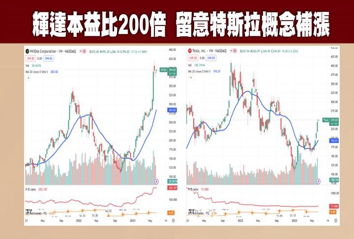 1.以輝達和特斯拉來做比較,雖然輝達目前是當紅炸子雞,但是他的本益比高達200倍以上,但特斯拉的股價扶搖直上之際,其本益比只有70倍。因此如果科技類股仍有漲市的話,目前的AI屬於高檔不應再追價;反之跟汽車相關的,如果還沒漲到。我們認為是下一棒的機會。