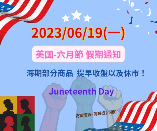 元富期貨小靜【2023年6月19日(一)美國六月節/期貨市場提早收盤/休市通知@微小道@微小那@微黃金@小輕原油@微sp@全台開戶@線上開戶】