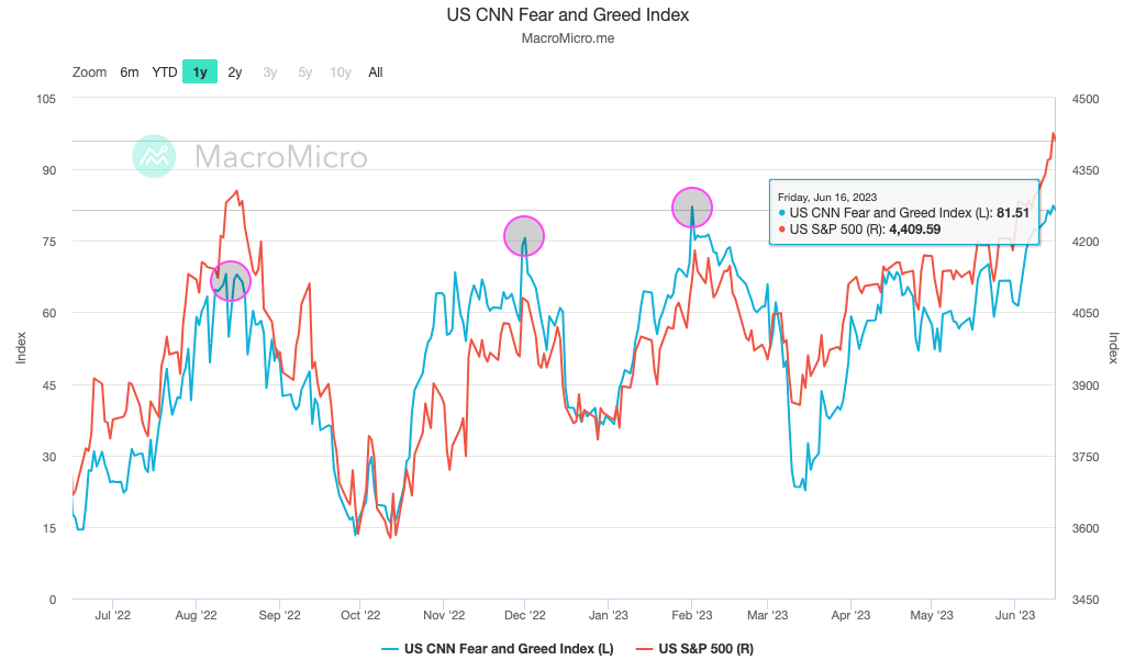 NAAIM 上週資料顯示主動基金機構持倉部位自 90.07 下降至 81.66 (圖 1-2),S&P 500 的 14 天 RSI 指標進入明顯超買區 (圖 1-3),CNN 的恐懼貪婪指數已進入極度貪婪區 (圖 1-4),S&P 500 近期回檔機率上升...