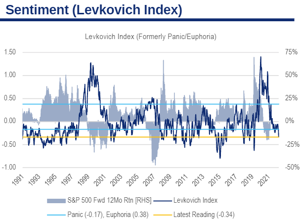 Citi 認為 S&P 500 即將上漲乏力,企業缺乏實質獲利成長、美國經濟衰退逼近,情緒指標 Levkovich Index 位於恐慌位置的 -0.18 (圖 1-9),重申 2023 年底 4,000 目標價,新增 2024 年中目標價 4,400,認為目前美股漲勢缺乏實際支撐