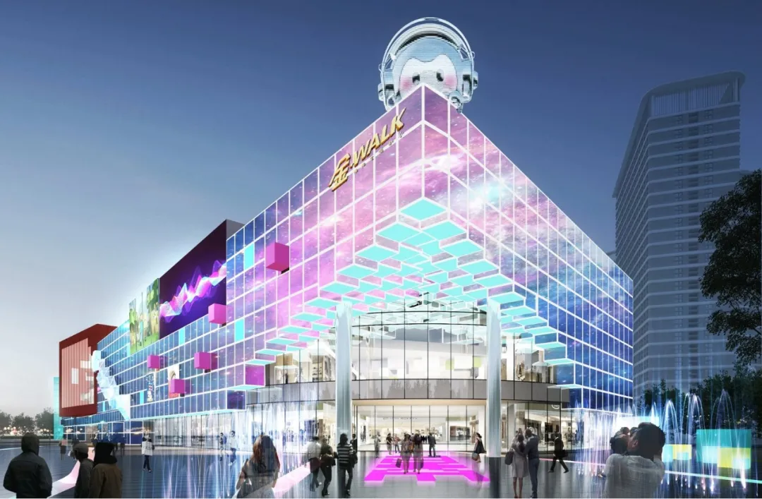 項目外立面打破傳統購物中心常規,首創遊戲化立面,並融入圖元化,馬賽克,沙箱元素,形成風格化明顯的城市介面。在設計手法上,專案將元宇宙遊戲中的圖元和方塊提煉出來,通過解構,重組,形成奇特的商業空間。這是十分有趣的建造方式,就像在玩積木遊戲,同時也是對元宇宙開放互動特點的最好詮釋。