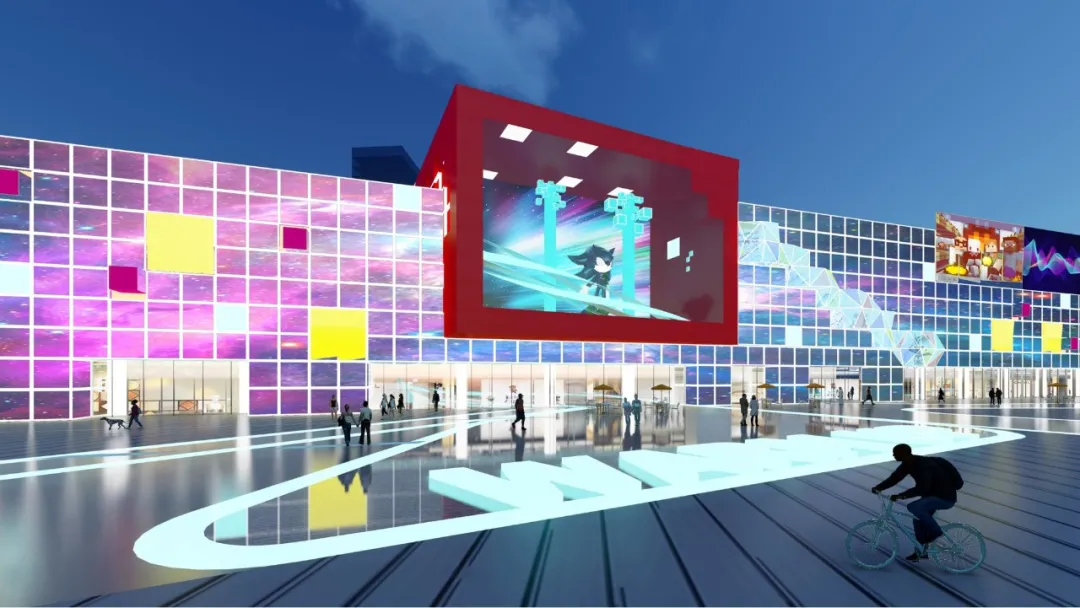 從入口廣場,主入口,Led人屏交互,到金小寶裝置,世嘉遊樂園,中庭再到次主力店,扶梯,屋頂遊樂園,我們試圖構建一個全新的元宇宙空間場景體系。