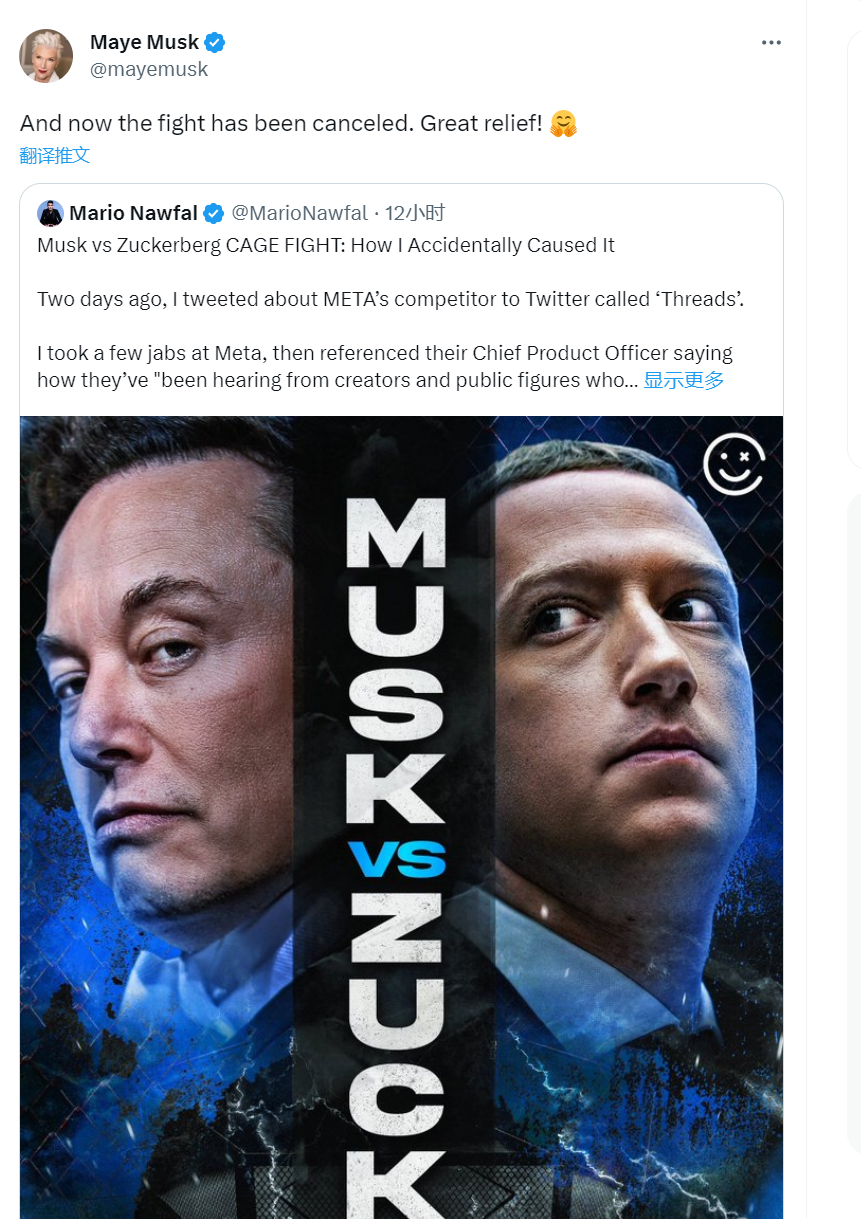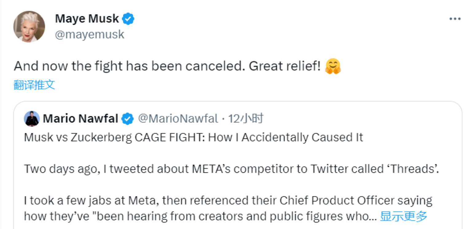 但6月23日,馬斯克的母親發推,宣布已經取消了這場比賽,還在推特上勸網友不要起哄。