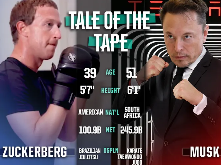 不妨先看看兩位選手的身體條件:馬斯克今年51歲,身高186厘米,體重至少超過170斤;而扎克伯格今年39歲,身高171厘米,體重至少140斤。(體重數字並不准確,只是外界的預估值,而且馬斯克剛剛減肥成功。)