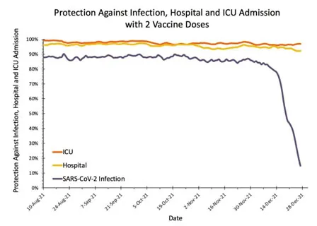 西方最新的數據顯示,因為omicron 變種病毒,目前接種兩劑疫苗的感染保護率,已從一個月前的近90%下降到14.9%,一旦感染,無法區分出到底是沒有接種還是已經完全接種。