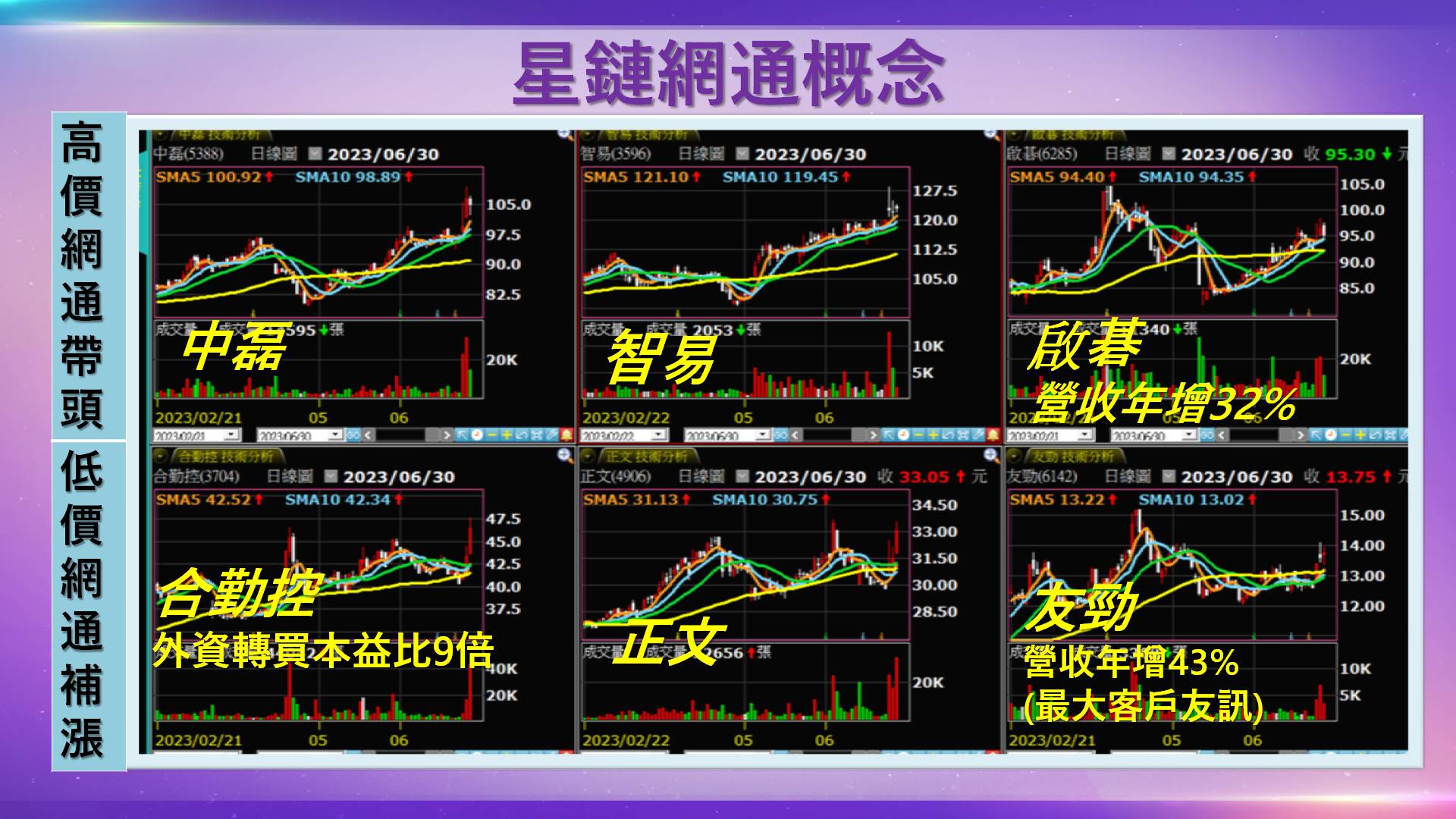 結論:目前全球戰場已從平面往立體、往太空科技發展。太空科技的關鍵仍在於無線網路、通訊。因此配合美國基建下鄉的網路通訊概念股。我們認為可以找低價低本益比的來做切入。啟碁為高價代表的一員,友訊為低價代表的一員可以來做觀察。友訊如價格偏高,則可以轉觀察友勁和合勤控,來做低本益比的佈局,下半年營收應該會持續增溫。興哥抖音