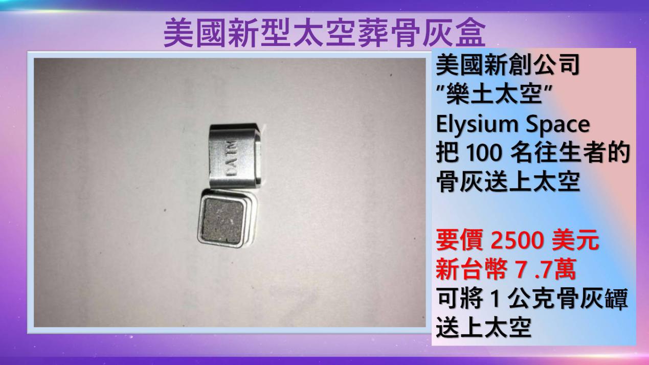 2018年美國「樂土太空」(Elysium Space)「樂土衛星 2 號」(Elysium Star 2),搭乘 Space X 回收火箭「獵鷹 9 號」(Falcon 9),把約100名往生者的骨灰送上太空,顧客花 2,500 美元就可以將往 1 公克的骨灰罈送上外太空去。