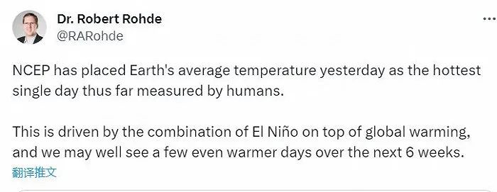 歐盟哥白尼氣候變化服務局也確認,週一和周二的全球氣溫創下了該機構1940年有記錄以來最高。英國帝國理工學院格蘭瑟姆研究所氣候科學家塞皮(Paulo Ceppi)認為本週的數據顯示,地球“至少12.5萬年”以來沒有像現在這樣熱。