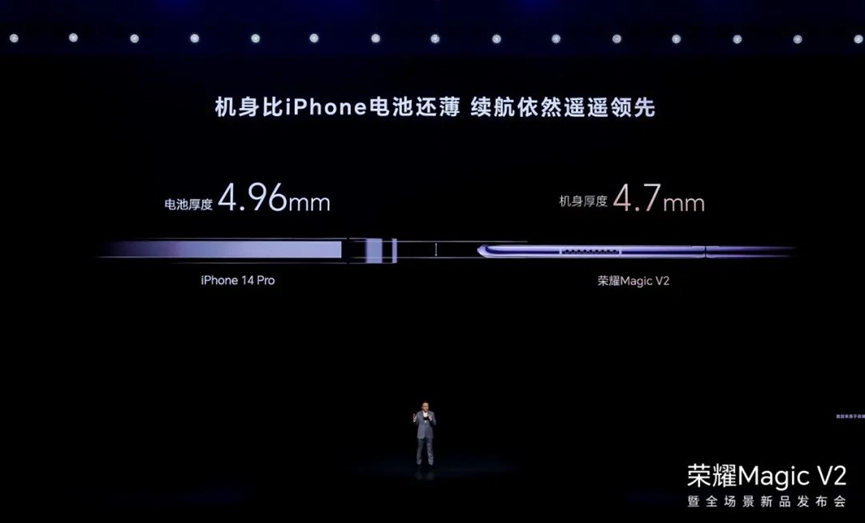 這個數據,不僅全面領先於華為Mate X3(羽砂版)的241克,更是比直板旗艦iPhone14 Pro MAX(240克)還要輕;並且如果你兩隻手各拿著榮耀Magic V2和iPhone14 Pro進行橫截面對比,就會發現,榮耀Magic V2的機身比iPhone的電池還要薄,真正意義上實現了折疊屏手機的“毫米級”進化。