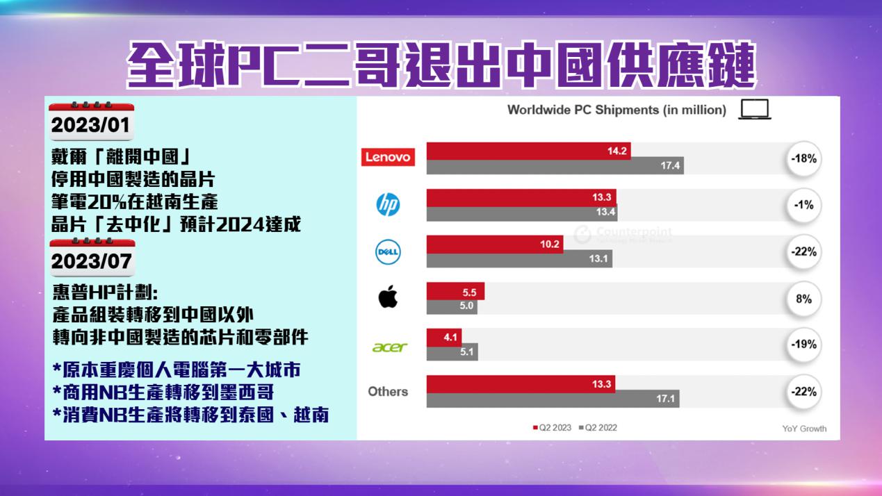更為激進是直接將中國製造的晶片排除在戴爾產品之外,並大幅減少對中國生產的電子元件總體使用量。多元化方案:2023年20%的筆電在越南生產。