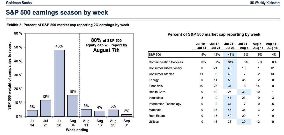本週為超級財報週,48%的S&P 500公司將發佈財報 (圖 1-1),最關鍵的事件是週三的 FOMC 會後鮑威爾記者會,#高盛認為Fed立場將較市場預期鷹派