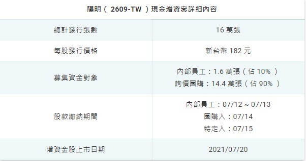 ▲ 陽明 2021 年現金增資案內容(資料來源:公開資訊觀測站)