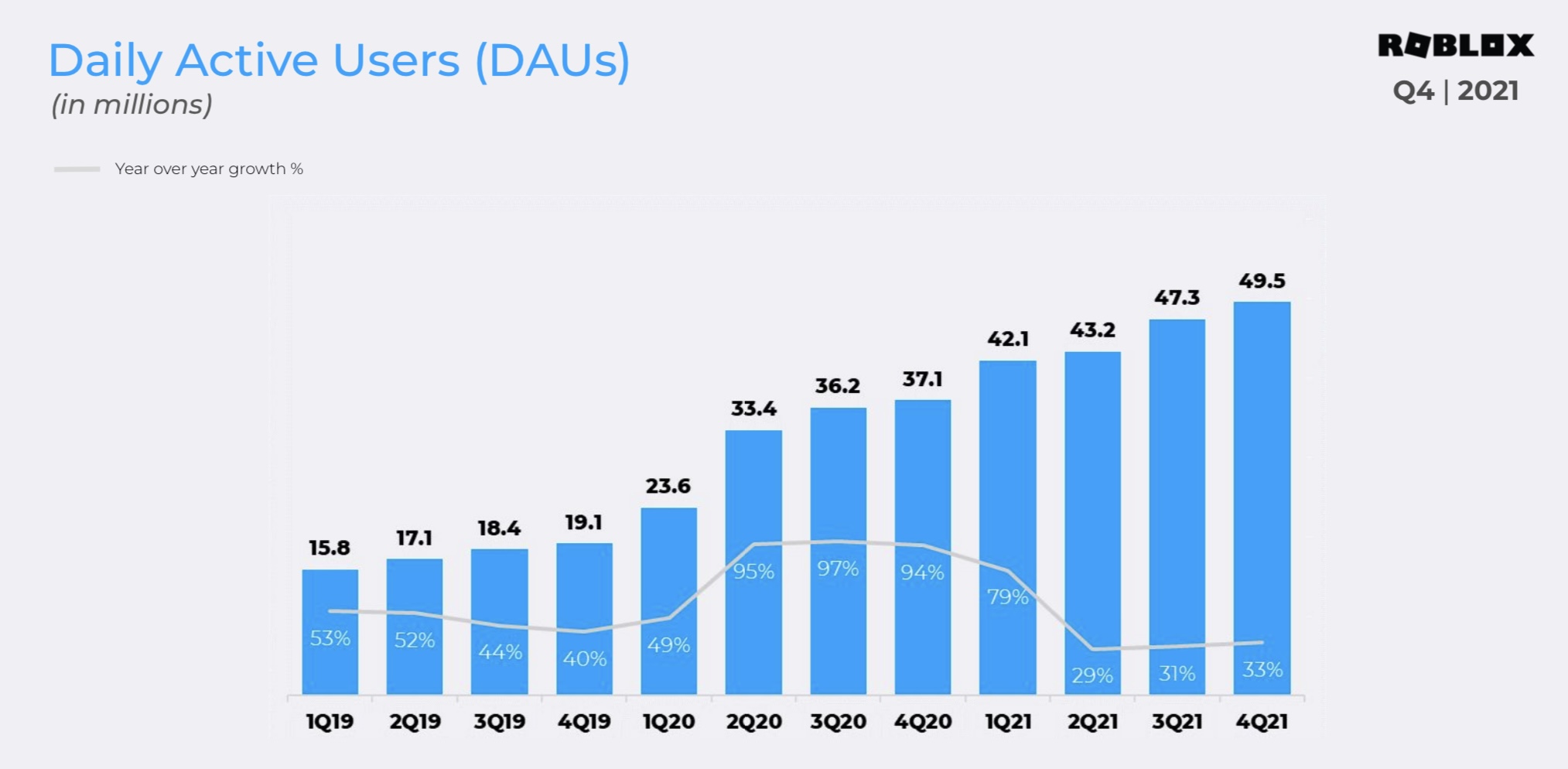 👎🏾圖3: DAU 4950萬、同比增長33%,但問題是2021大幅放緩,除遠低於2020外,也低於2019的40%~50%