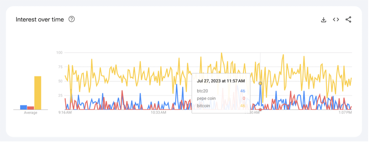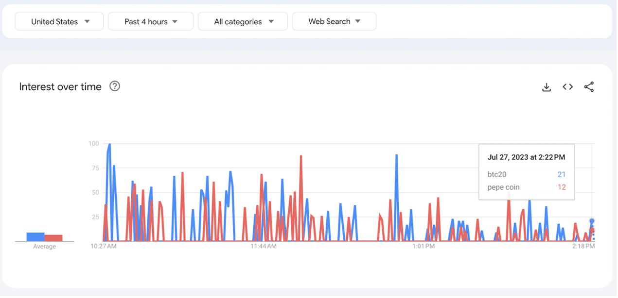 這些結果在其他地區開始交易時可能會類似。例如,這裡是美國過去四小時的Google Trends數據,採樣於美國早盤交易時段 – BTC20勝過了‘pepe coin’: