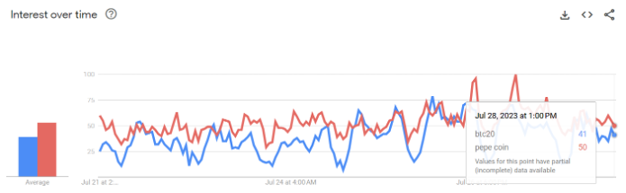 正如下面的圖表所示,過去一周內,BTC20一直吸引著接近或更多的搜索興趣,與 Pepe幣相媲美。