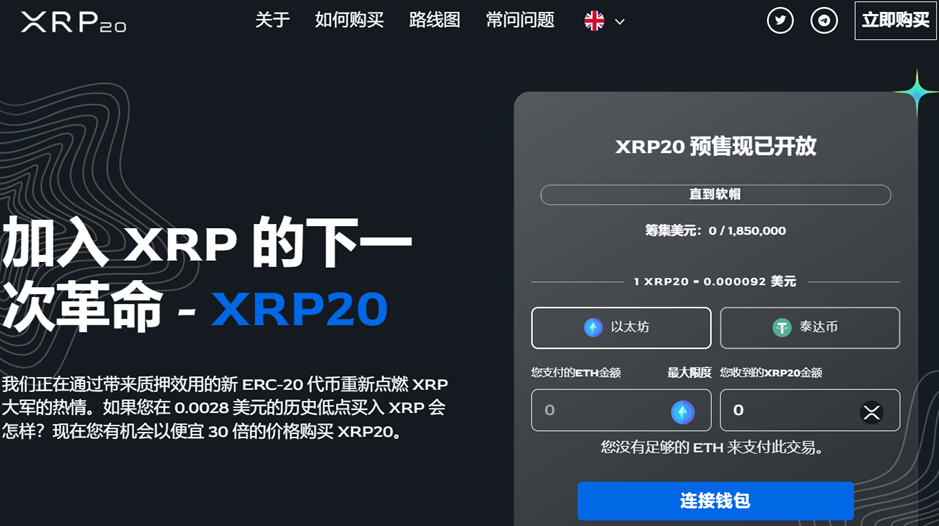 「XRP20」預售後,通過新型 ERC-20 代幣帶來之質押效用,重燃「XRP」之熱情。如曾于歷史最低點0.0028美元未購買「XRP」,今有機會以低30倍之價格即$0.000092購得XRP20。