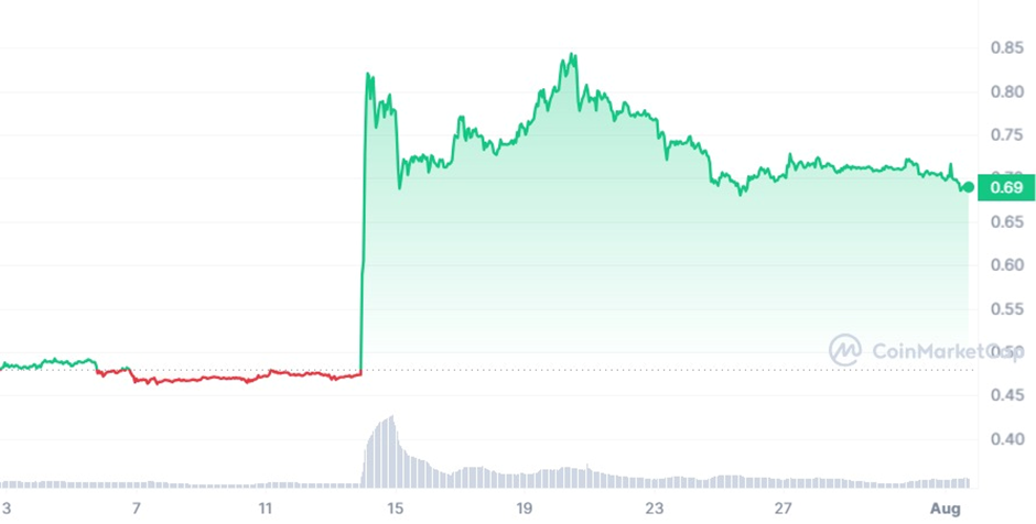 XRP的表現相對穩定,在撰寫本文時交易價格約為0.7美元,一個月價值上升47%。近期反彈來自於Ripple v. SEC案件的正面裁決,增強了市場對該代幣未來的信心。這也添加了更大的論述,即愈發活躍的altcoin市場可能會挑戰比特幣長期以來的霸主地位。