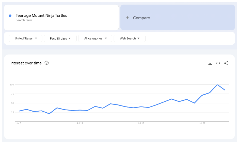 Meme幣市場是一個善變的領域,喜歡跟隨一個個潮流。然而,只要一個相關的迷因幣在網路上引起了很大的關注,它有可能乘勢而上。鑒於該電影的熱度以及其成為夏季熱門之一的可能性,Cowabunga Coin很可能成為一個符合預期且長久存在的meme幣。在過去的30天裡,“忍者神龜”這個搜索詞在穀歌搜索中的熱度越來越高。以下是美國地區的搜索趨勢圖表:
