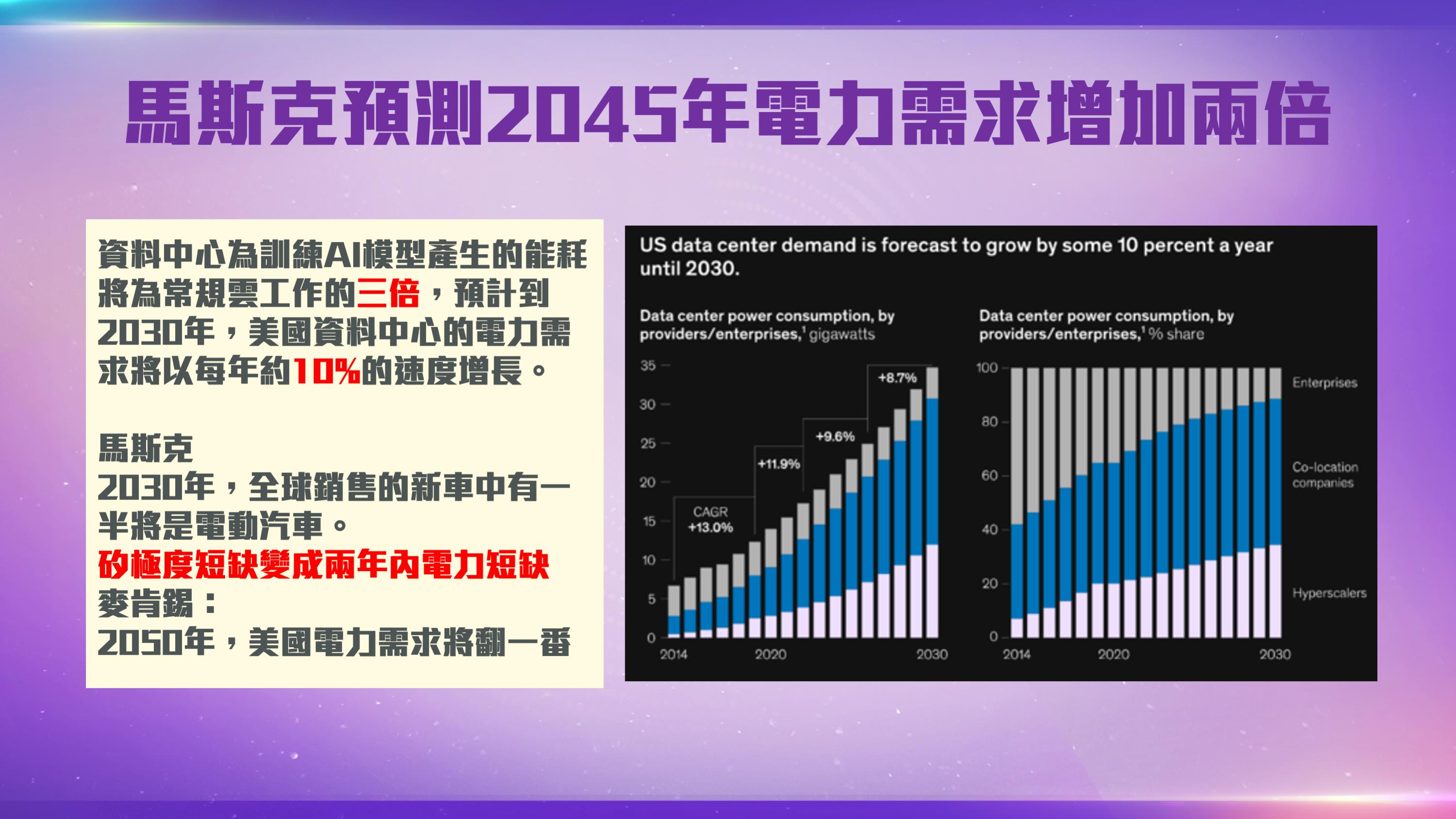 AI需求大爆發,但特斯拉執行長又出來吐槽!預計兩年內全球將由缺矽變為缺電,會阻礙AI的發展。馬斯克預測:2045年的電力需求將為目前的兩倍,而AI服務器耗能暴漲三倍。「若電力需求穩定且沒有大變化,那麼項目可以推遲;若快速變化,導致電力需求不斷增加,就必須採取更多行動。」