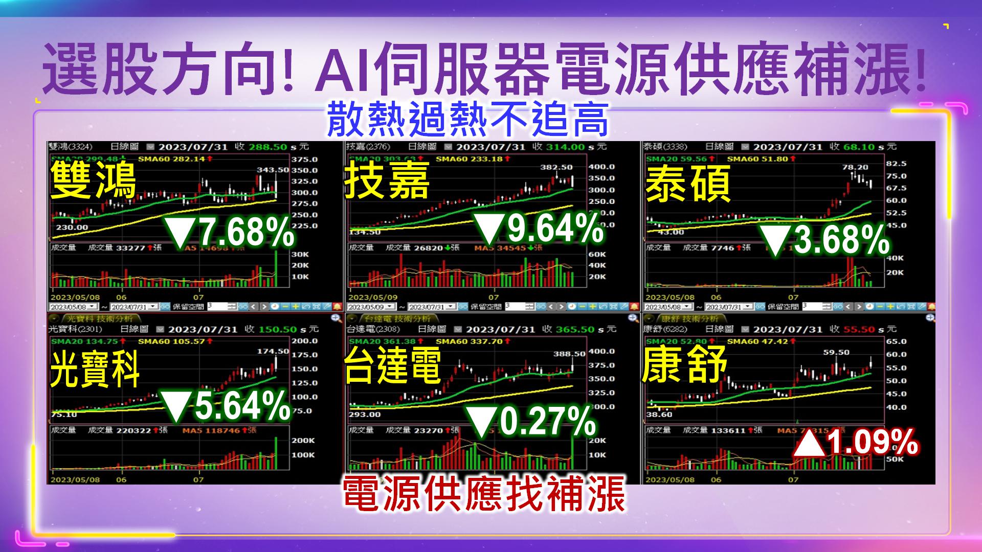 馬斯克在星鏈計畫twitter X之後最新大膽狂言,就是預測AI接下來會面臨缺電危機,所以AI股的拉回早就預測在先。接下來的重點就是會轉往尋求電能的部分,在電能部分如要持續的往上做堆疊。馬斯克認為基本上接下來就要考慮散熱、儲能等都會是特斯拉發展的重點。因此我們在操做選股的方向上,散熱的族群就看龍頭雙鴻,雙鴻撐得住,整個盤面才有機會做指引的動作。而電源方面光寶科近期也出現比較大的爭議,開始回檔,不建議現在去做炒底。反而應該趁著拉回的時候去觀察康舒,看看有沒有機會再電源供應器裏面去找到往不同市場銷售的機會。目前來說整個盤面還是屬於相對弱勢,建議多觀望少操作,直待主體出現再行進場。興哥抖音