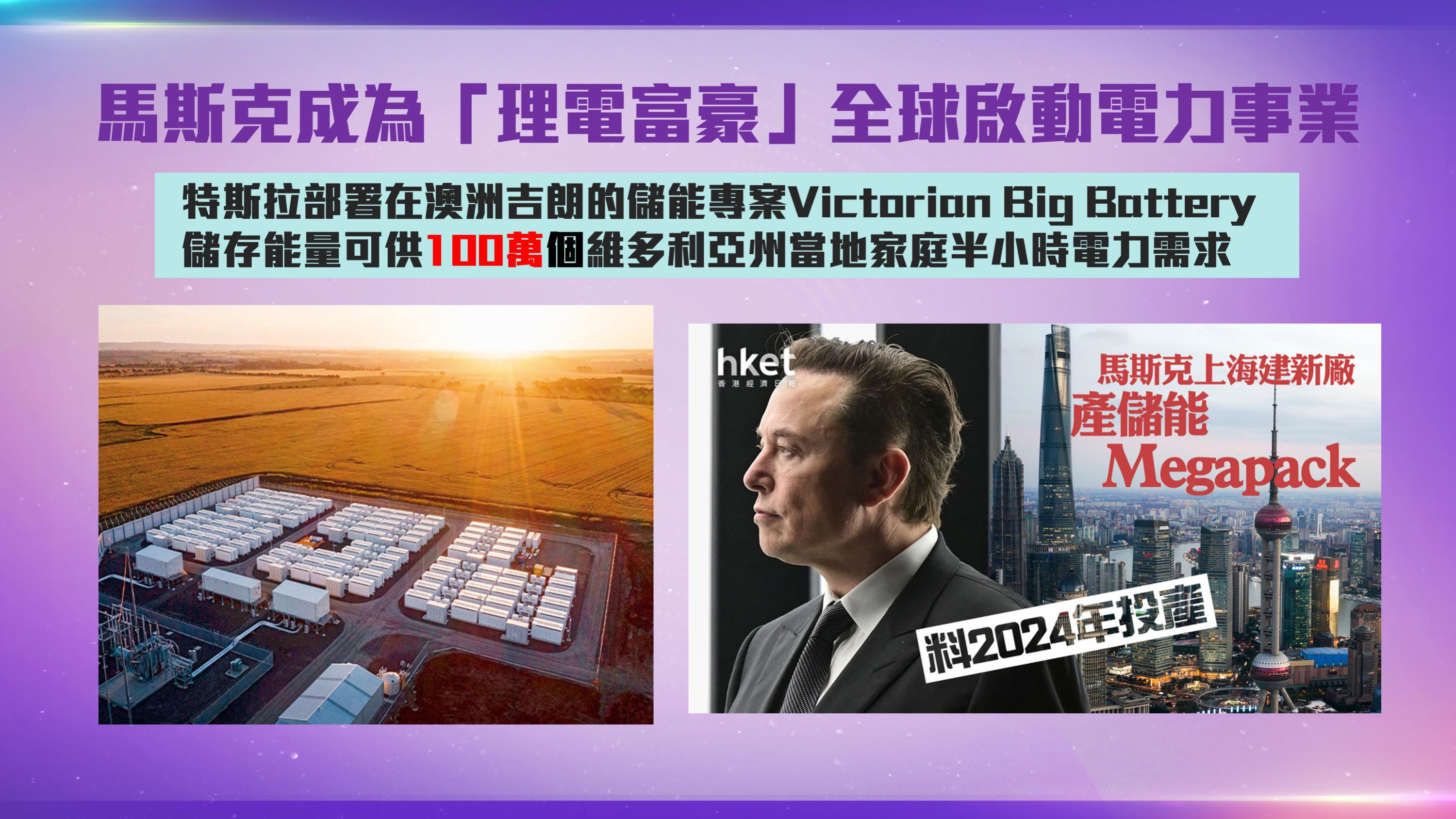 馬斯克2018/09/29在南澳洲出席高效能電池儲存系統Powerpack慶祝活動,正式與當地政府、法國風力發電場開發商Neoen簽屬合約,承諾在合約生效後100天內,讓南澳洲的儲能廠完工。馬斯克:如果超過100天才建好,這個儲能廠就免費奉送給南澳洲,總價值約5千萬美元。結果成功了後來真的100天就蓋好了,「維多利亞大電池」(Victorian Big Battery),幫助維多利亞州實現到2030年50%的可再生能源目標。
