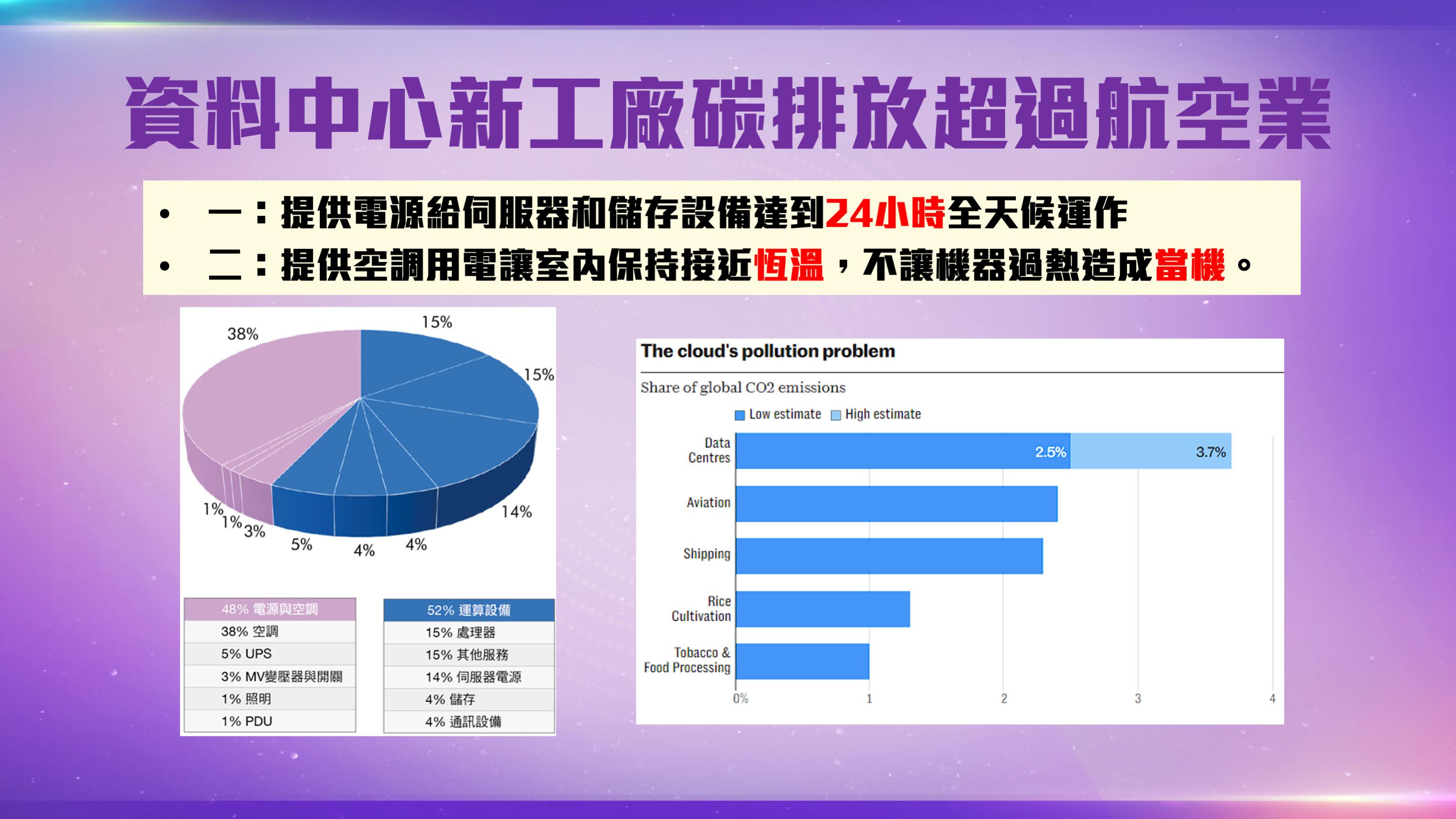 一座資料中心消耗電力,等於 5 萬戶家庭用電量。1.資料處理和儲存會造成龐大污染。2.除了伺服器運作需要電力,且不能過熱,要消耗更多電力和水。3.設備由稀有且昂貴的資源製成,且需要維修和更換,都涉及高污染排放。