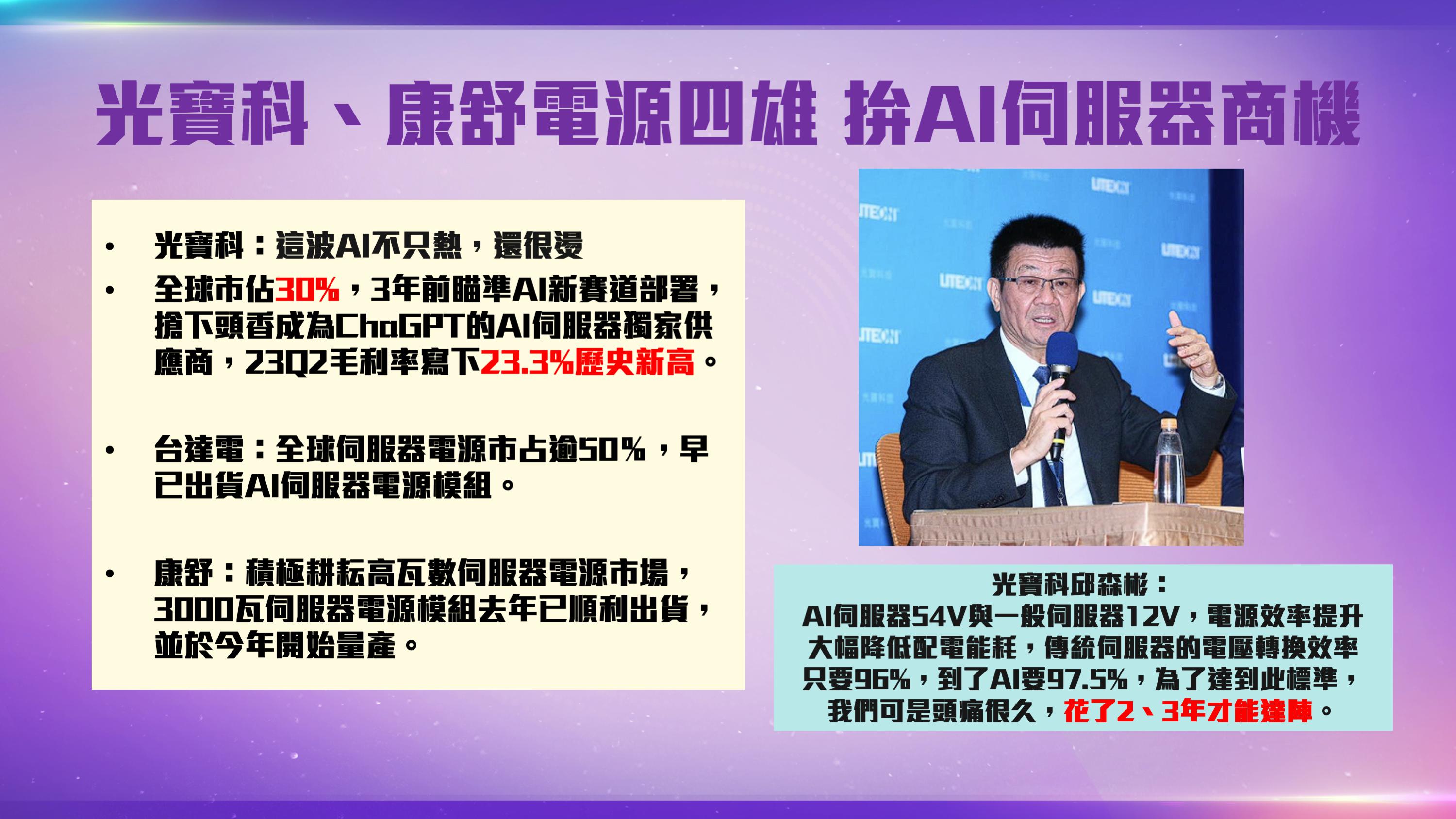 全球電源二哥光寶科技3年前瞄準AI,不但搶下頭香成為ChatGPT的AI伺服器獨家供應商,而且今2023第二季毛利率更寫下23.3%歷史新高,令市場驚豔。