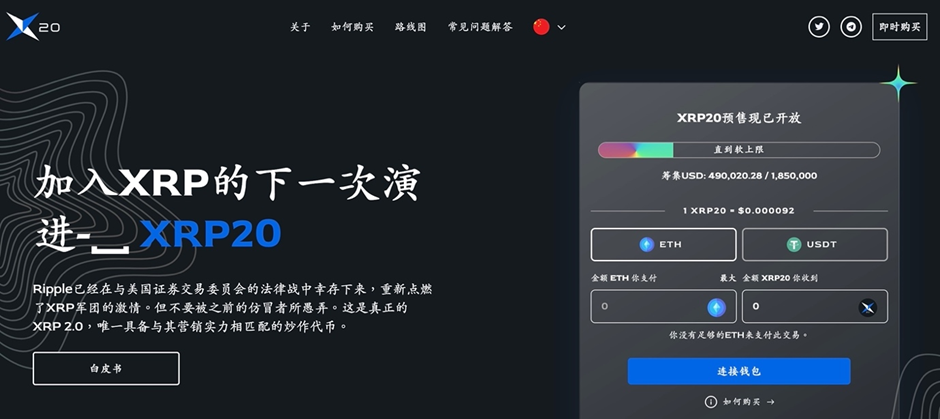 「XRP20」預售後,通過新型ERC-20 代幣帶來之質押效用,重燃「XRP」之熱情。如曾于歷史最低點0.0028美元未購買「XRP」,今有機會以低30倍之價格即$0.000092購得XRP20。