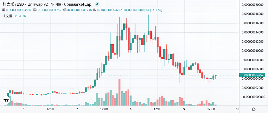 在電影上映後不久,一個非官方的同名迷因幣「科太幣」也開始走紅。根據加密貨幣排行網站CoinMarketCap的數據顯示,一個以0xdc5e開頭的加密貨幣「科太幣」在8月5日下午悄悄發行。當時的開盤價只有0.000000000006美元,但到了8月7日,價格一度暴漲至0.000000018675美元,累計漲幅高達311,150%,相當於三天內漲了約3千倍。