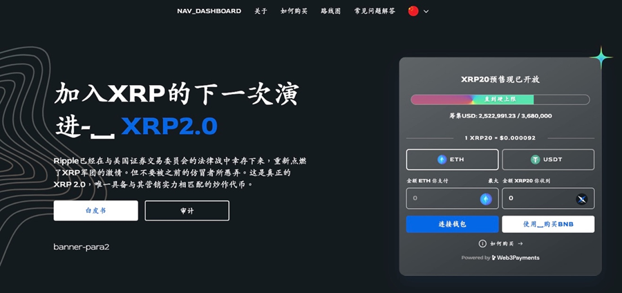 要購買 XRP20 代幣,只需在 xrp20coin.com 網站上連接您的加密貨幣錢包,然後使用乙太坊、BNB 或 USDT 進行支付。