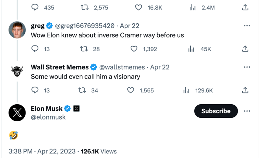 馬斯克在Twitter上寫道:“@wallstmemes @greg16676935420 🤣” / X