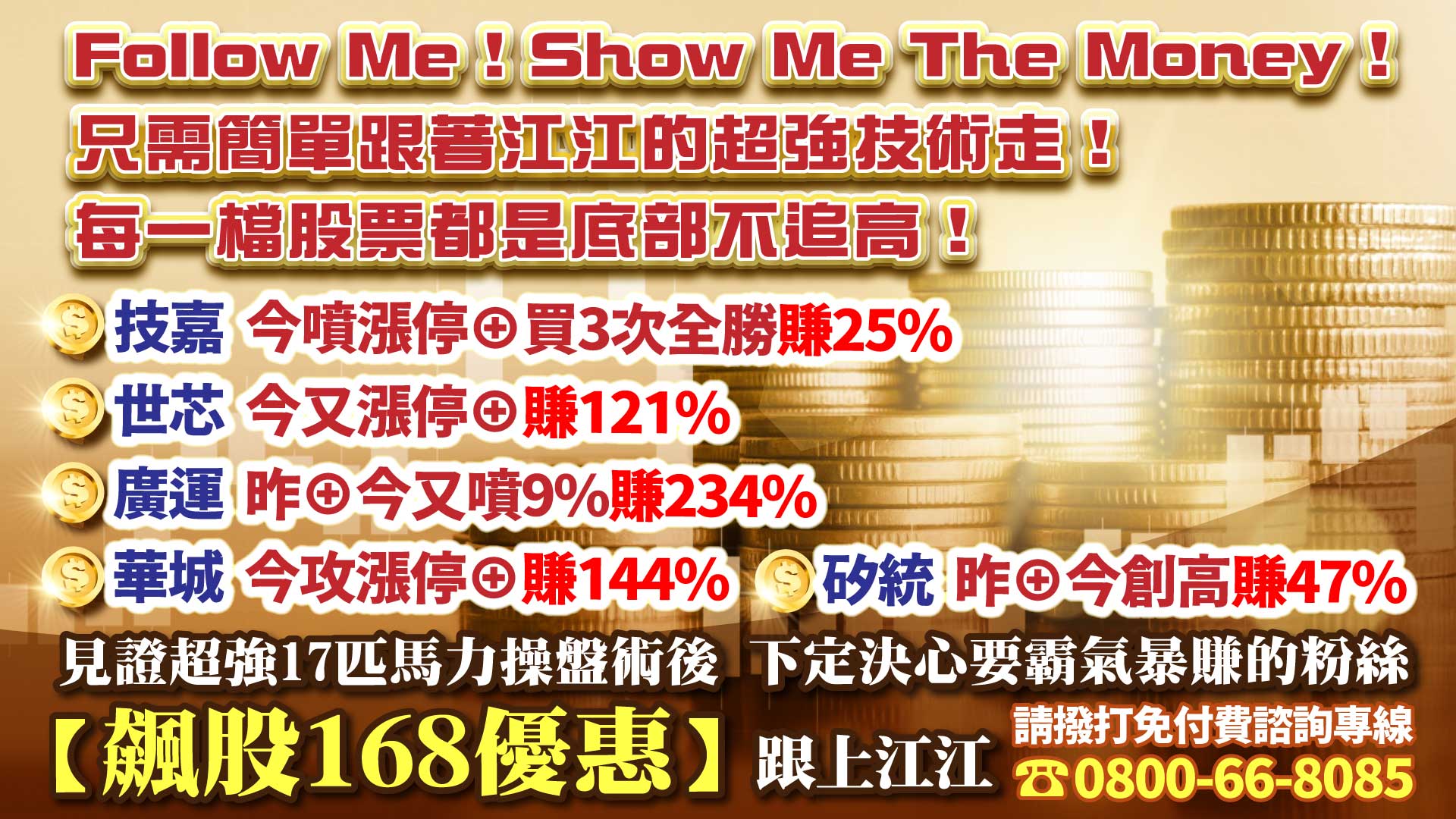 只需簡單跟著江江超強技術走!每一檔股票都是底部不追高!技嘉⊕賺25%、世芯⊕賺121%、華城⊕賺144%、廣運創高賺234%!飆股168優惠→霸氣跟上江江!
